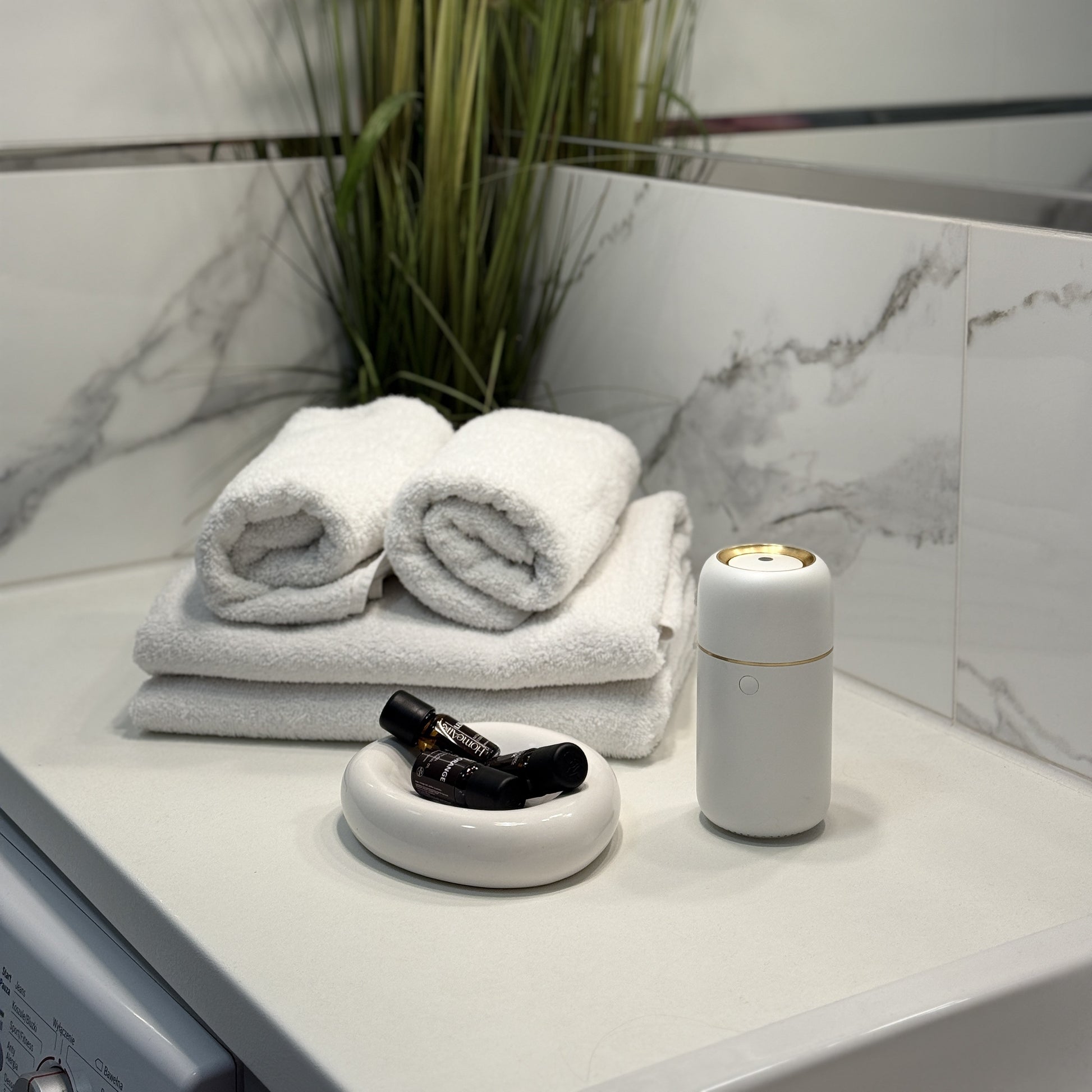 Biały dyfuzor ze złotym akcentem – dopracowany wygląd, który wygląda jak biżuteria dla wnętrza.